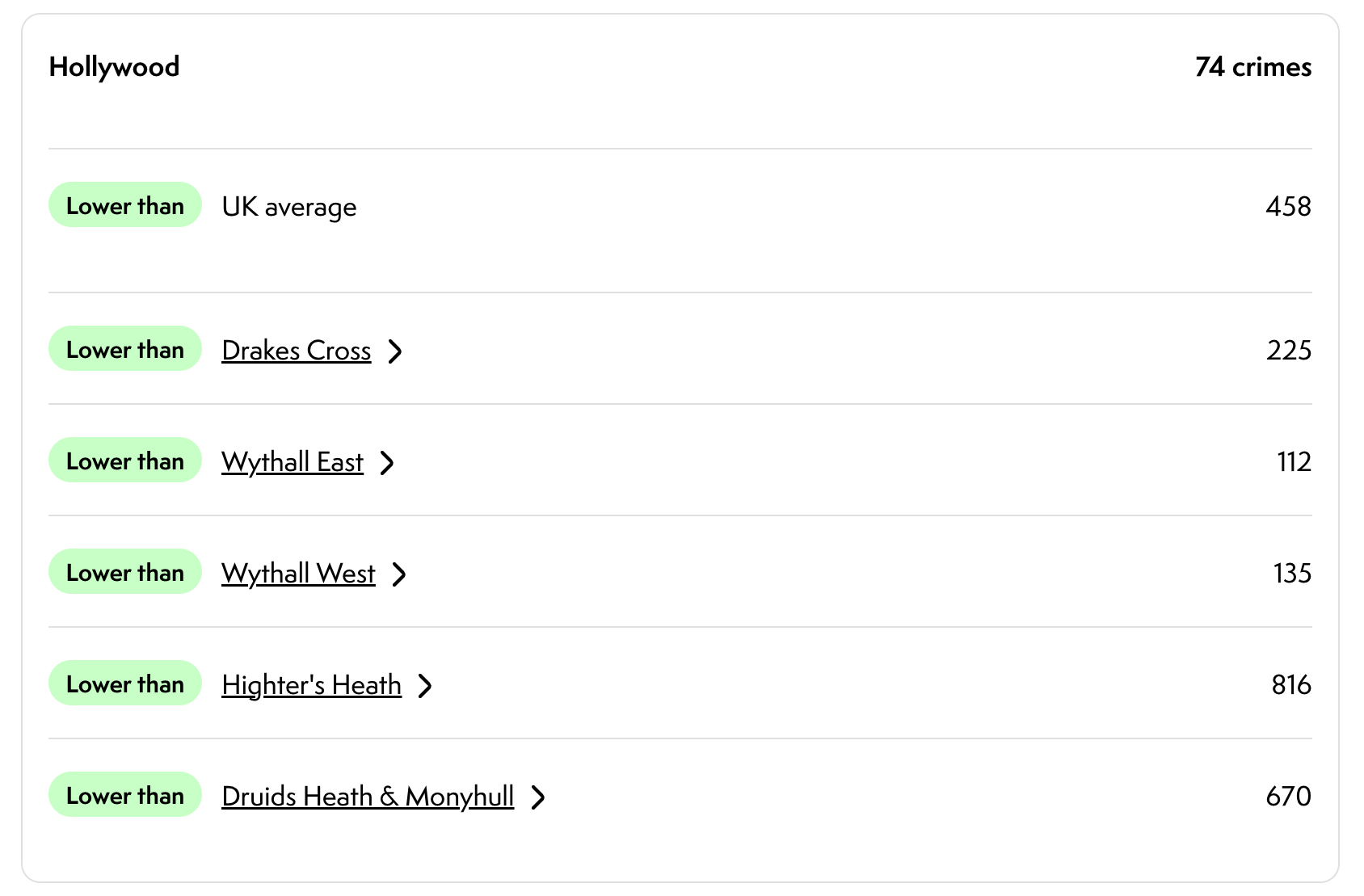 Hollywood enjoys notably low crime levels, with rates consistently well below the UK average and showing continued improvement over recent years. In 2024, the neighbourhood recorded around 10 incidents per month compared to the national average of 54, making it one of the safer areas in the region.