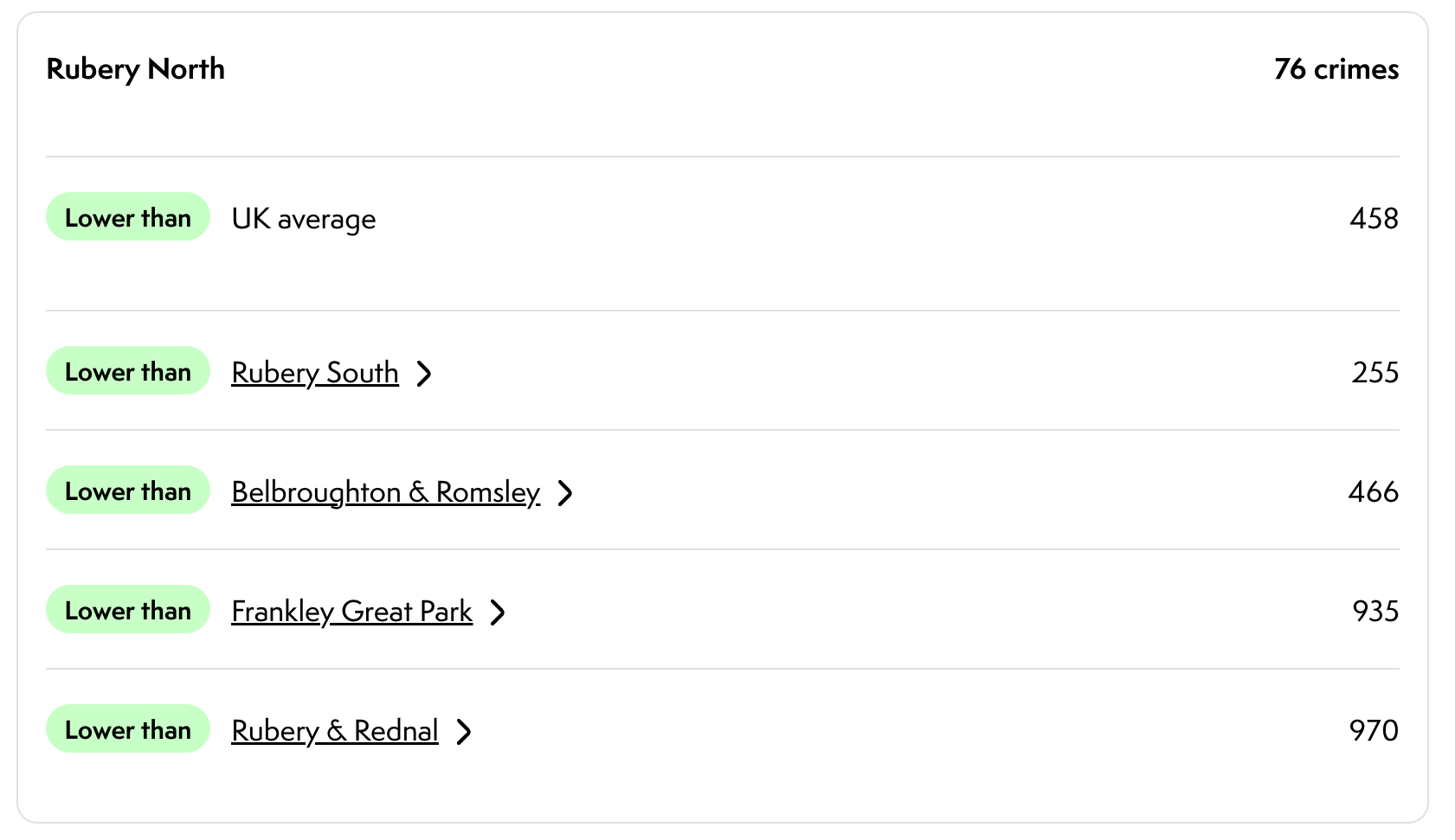 What's particularly notable is how Rubery North compares to surrounding neighbourhoods. It records significantly fewer incidents than adjacent areas like Frankley Great Park and Rubery & Rednal, which average around 80 to 128 crimes per month. This makes Rubery North a notably quieter pocket within the wider Rubery area, appealing to those seeking a peaceful residential environment.