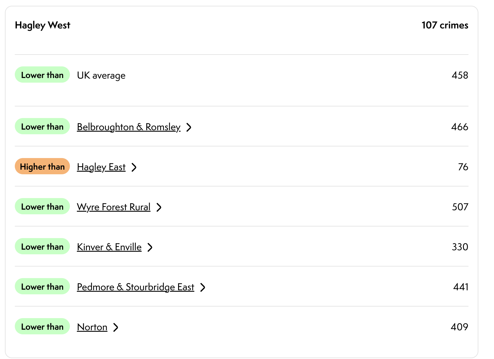 The neighbourhood's low crime rate reflects a settled, community-focused environment. Neighbouring Hagley East shows similarly low figures, suggesting this is a genuinely peaceful part of the West Midlands where residents can feel secure in their daily lives.