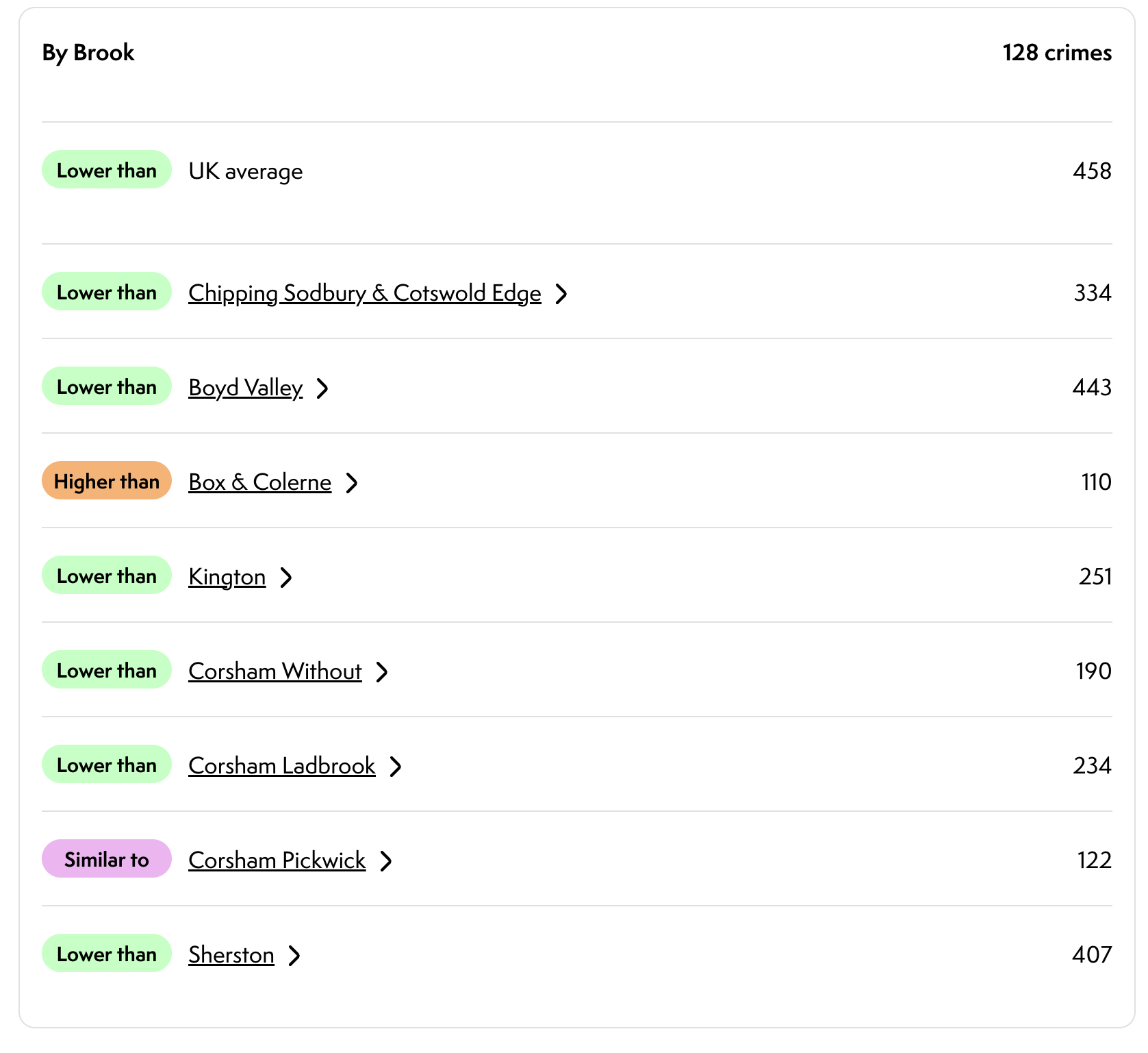 The 2025 data through December shows the neighbourhood continuing this positive trend. By Brook compares favourably to surrounding areas, with only Box & Colerne recording similarly low figures. This sustained pattern suggests a settled, secure community where residents can feel confident about safety.