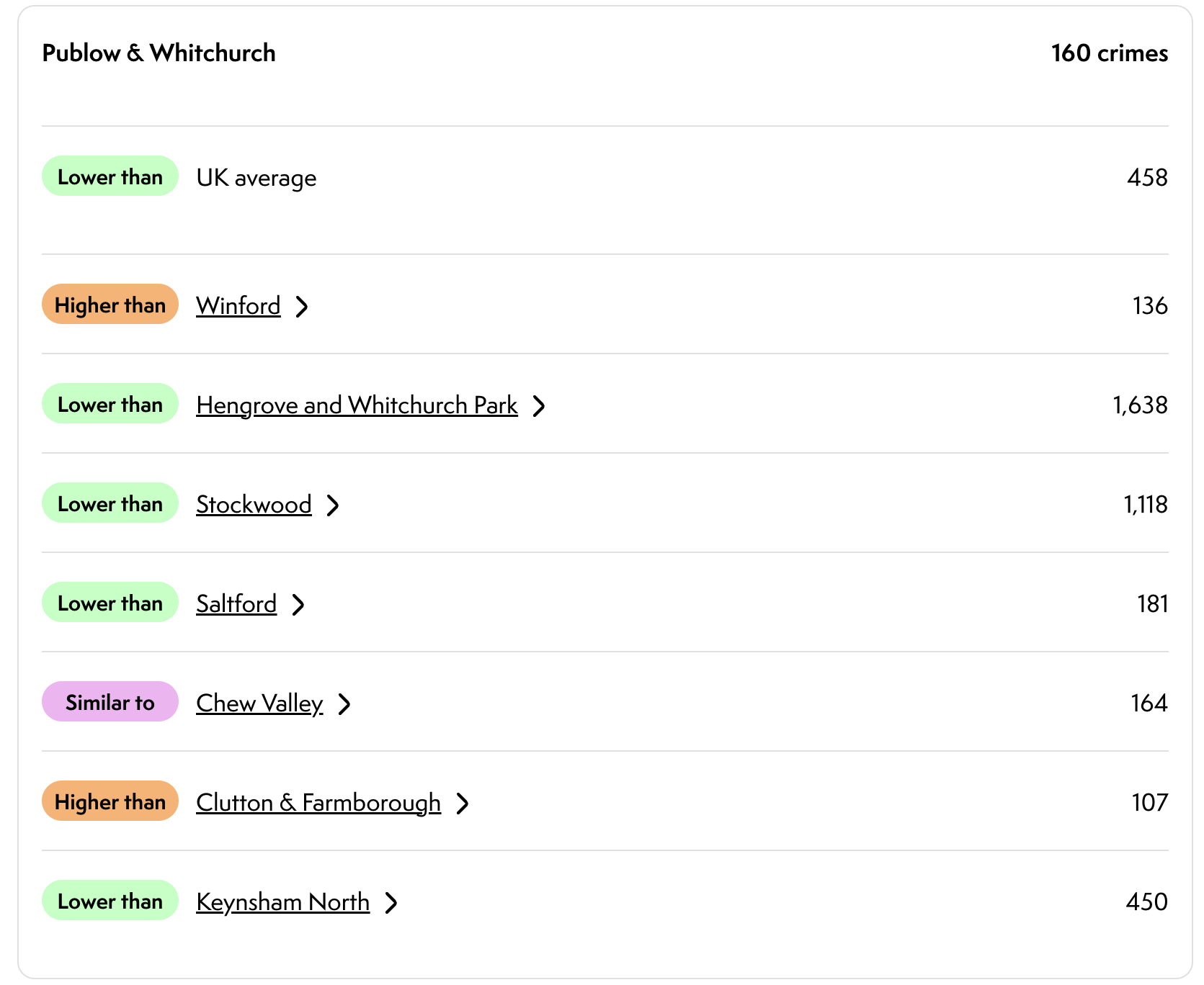 Publow & Whitchurch maintains crime levels well below the UK average, with around 24 incidents per month in 2024 compared to the national average of 54, making it a notably safe neighbourhood for families and homebuyers.