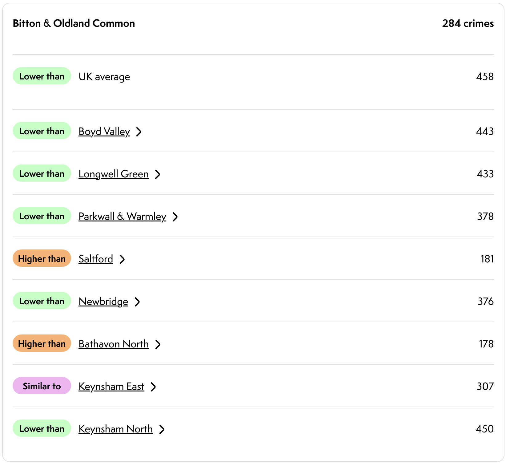 The area consistently records less than half the crime rate of a typical UK neighbourhood. In 2023, there were 245 incidents across the year, rising slightly to 289 in 2024, but this remains significantly lower than national figures. The neighbourhood compares favourably to surrounding areas too, with similar low crime levels to rural Chew Valley and Clutton & Farmborough.