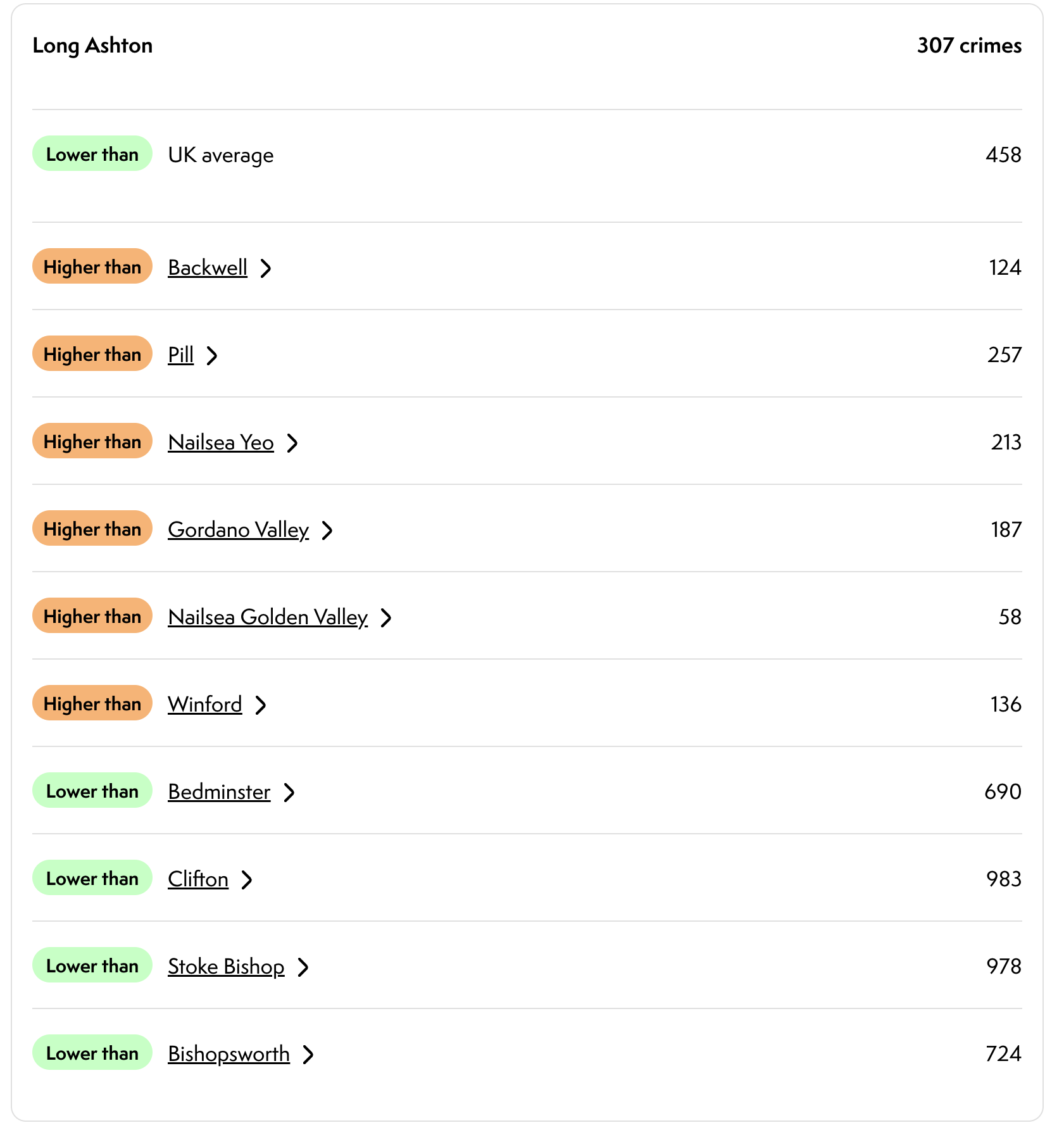 Long Ashton maintains crime levels well below the national average, with around 26 to 38 incidents per month compared to the UK average of 38 to 55, making it a relatively safe and settled community.