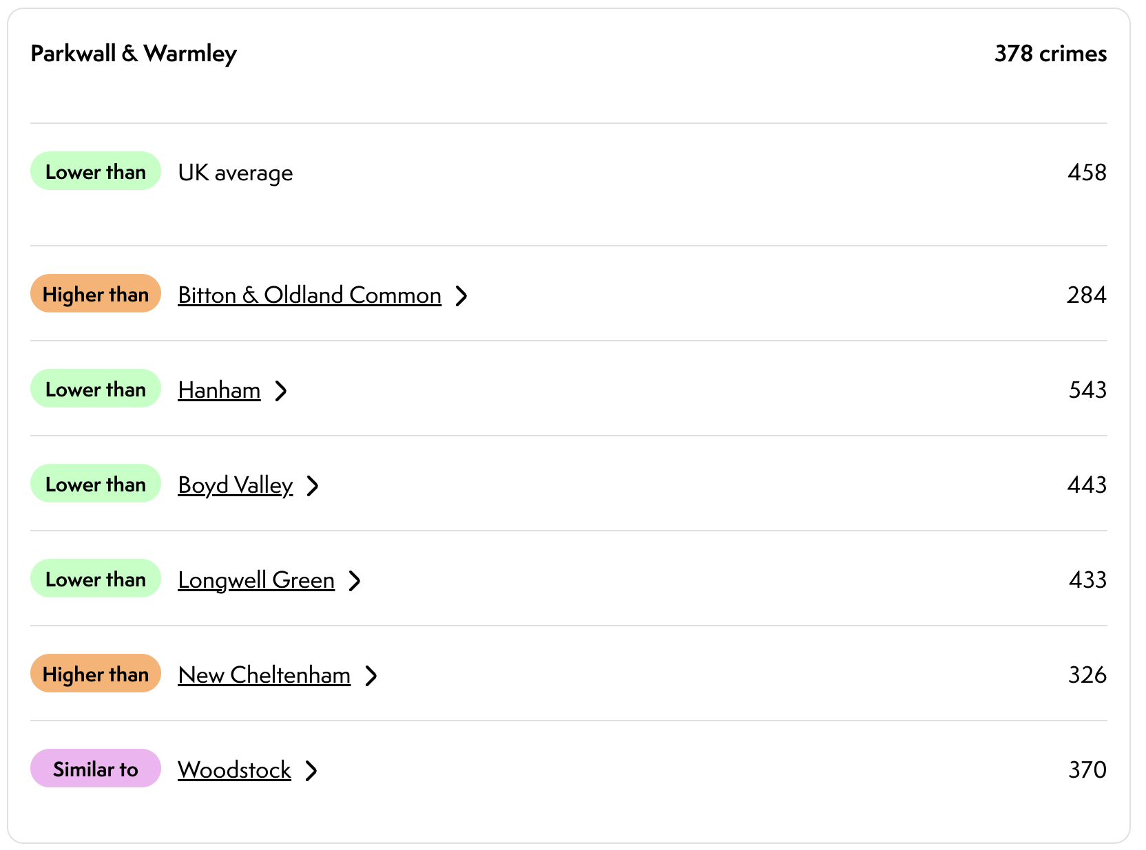 Bitton & Oldland Common consistently records crime levels well below the UK average, with around 36 incidents per month compared to the national figure of 54, making it one of the safer neighbourhoods in the South Gloucestershire area.